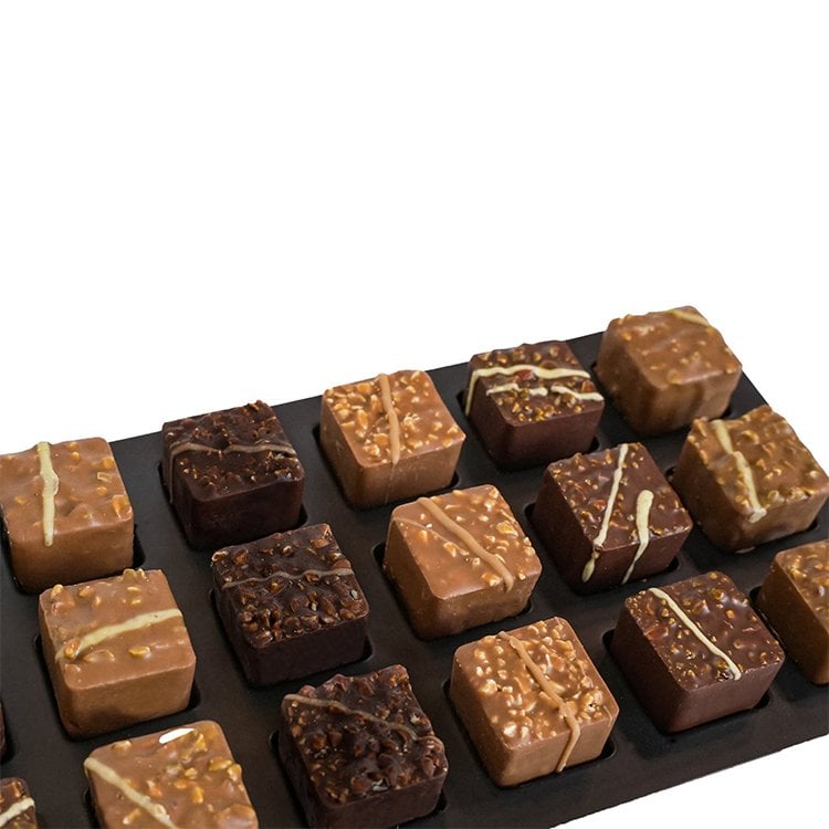 İpeksi, çıtır ve yoğun kıvamıyla içi pralin dolgulu bu enfes çikolatalar, Antep’in baklavalık fıstığı, Giresun’un fındığıyla çikolataya eşsiz bir lezzet katıyor. Dünyanın sadece 'pistachio' olarak adlandırdığı Antep fıstığına biz bendane, boz, merverdi, kırmızı iç diye ayırdık ve aromasına, hasat dönemine göre isimlendirdik keza fındıkta da aynı şansa sahiptik. İşte, en iyi kuruyemiş ve en kaliteli Belçika çikolatası "Guru Koleksiyonu"nda buluşuyor. İki sütlü, iki bitter seçeneğiyle. İçi krokan pralin dolu Guru koleksiyonu.